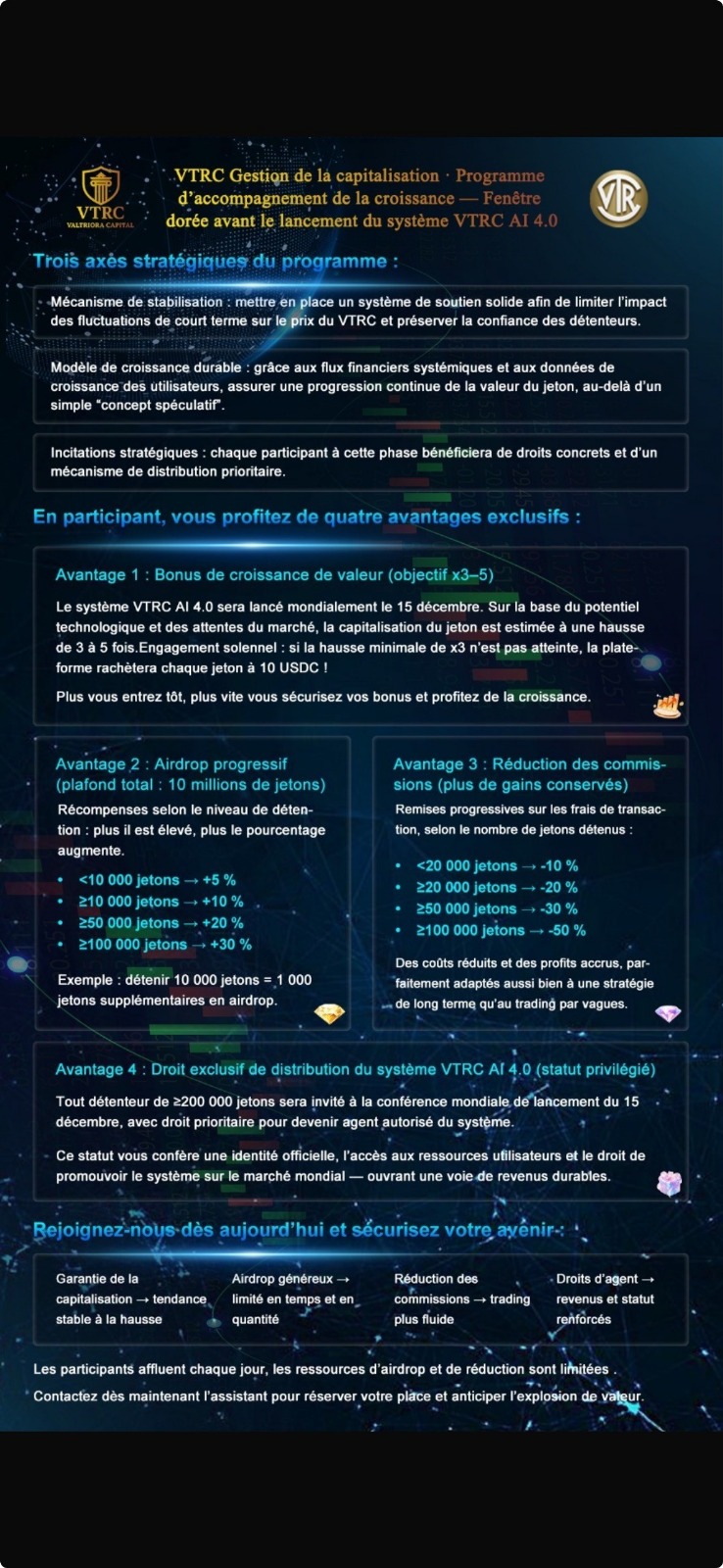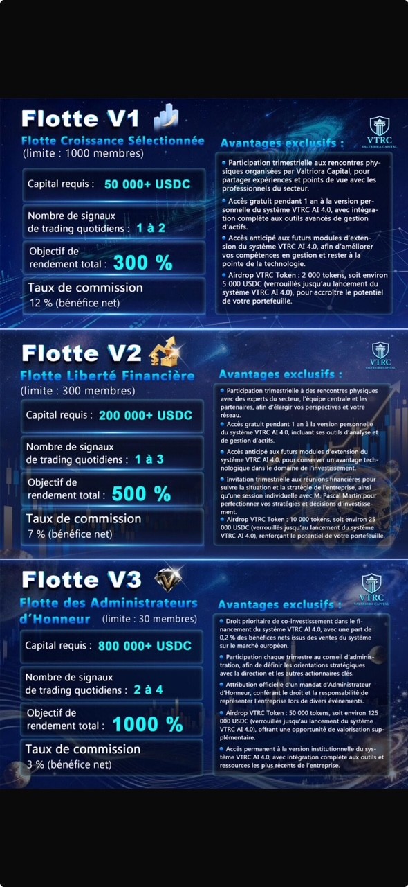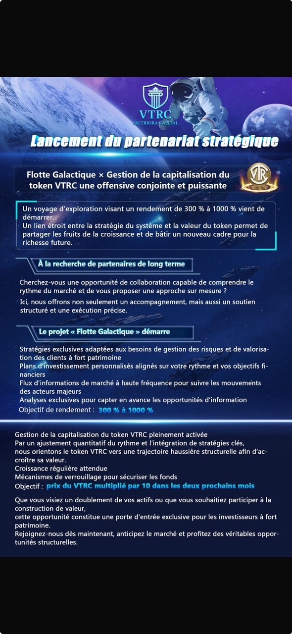 Il est proposé notamment d’investir dans un “partenariat stratégique – flotte galactique – gestion de la capitalisation du token VTRC”